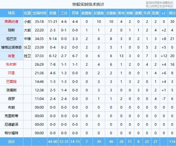 快船:莱昂纳德30分10板4助2断、祖巴茨21分8板3助2帽、哈登20分6板13助3断、科林斯16分6板1助2断、邓恩9分2板1助、保罗6分1板2助、洛佩斯5分3板3帽、琼斯4分2板、巴图姆3分3板1助3断2帽、博格达诺维奇5板1助